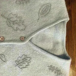 Warm and rustic long-sleeve wool cardigan with classic leaf embroidery and shell buttons. Layered over a dress, or T-shirt, and jeans, it's the perfect addition for anyone into grannycore or cottagecore wardrobes.