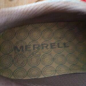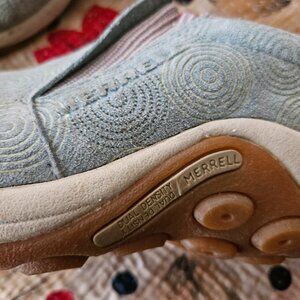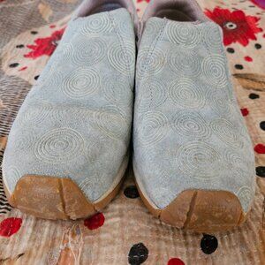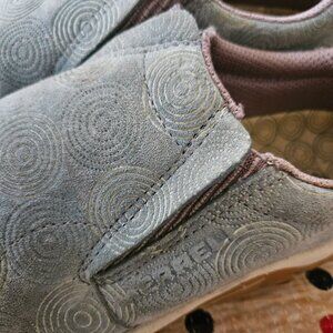 Very cute light blue suede slip-ons from Merrell. They have a repeating circular pattern pressed into the suede. Comfortable, good condition...lots of wear left. 8M but I think they run slightly large. Pet free, smoke free home.