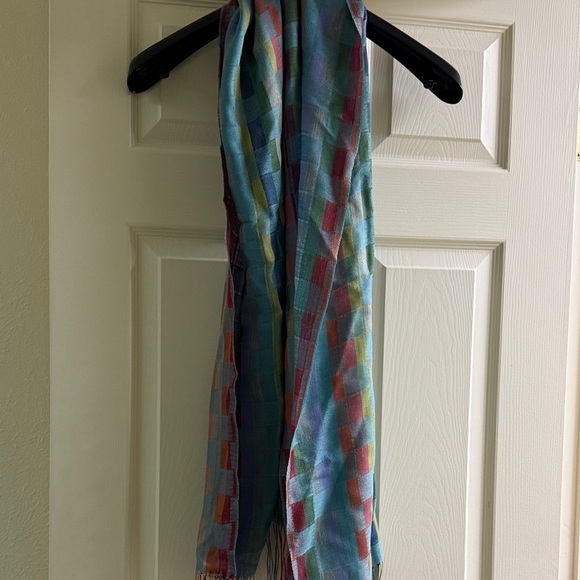 Soft light blue scarf with multicolor check pattern. Lightweight and versatile for everyday wear. Adds a pop of color with subtle red, yellow, and green accents. Easy to style and layer for seasonal looks.
