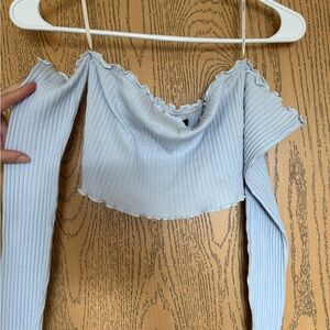 Elevate your style with this chic light blue off-shoulder ribbed top. Perfect for casual outings or a night out, this top offers both comfort and elegance.