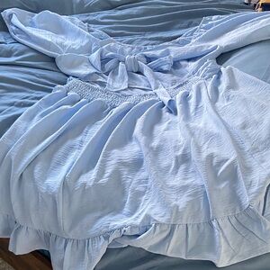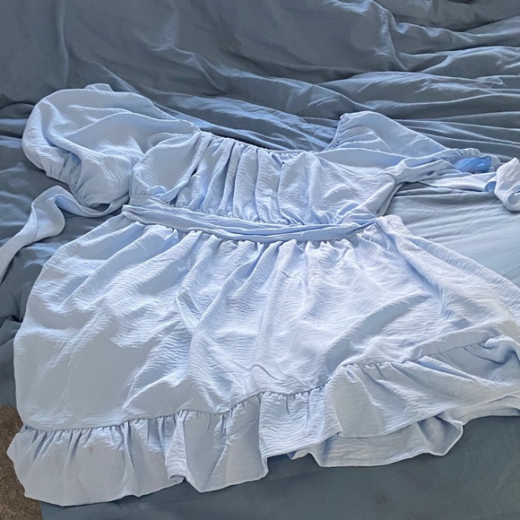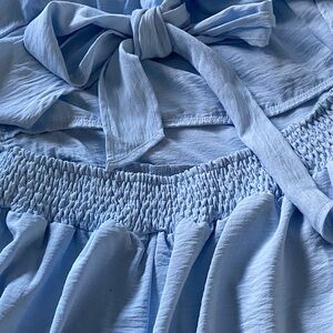 Soft light blue off-shoulder dress. Elasticized neckline and waist. Flowy skirt with ruffle hem. Lightweight textured fabric. Feminine and versatile style.