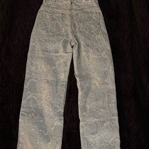 Stylish light blue jeans with a unique pattern. Perfect for casual wear.