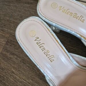 light blue pointed mules with a decorative gold chain trim across the vamp. Slip-on design with a low sculpted heel for easy, polished wear. Subtle textured pattern on the upper adds refined shimmer. Great for dressing up spring and summer looks.