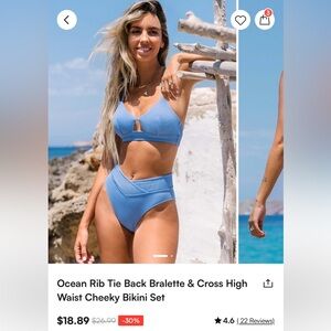 Stylish and comfortable, this light blue ribbed bikini set is perfect for a day at the beach or pool. Enjoy a flattering fit with its unique design. This has been washed but it hasn’t been used.