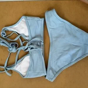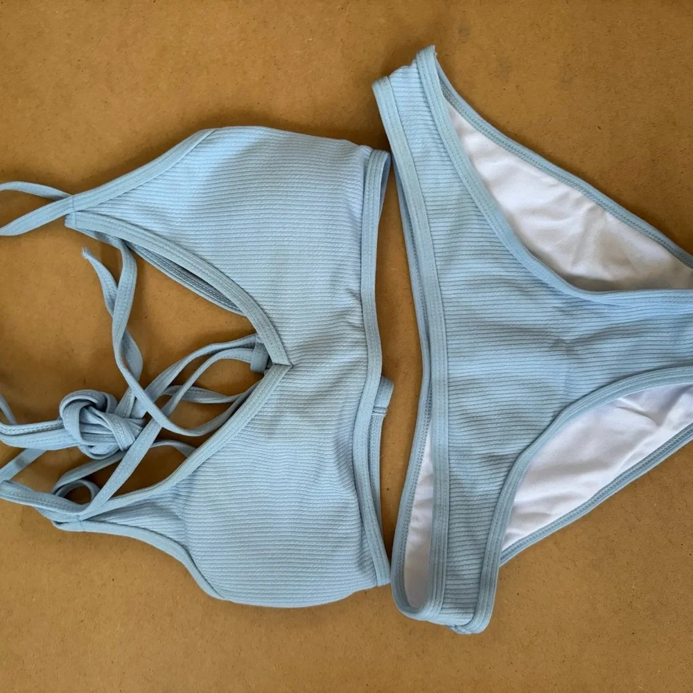 Two-piece ribbed bikini in a soft light blue. Top features tie-back straps. Matching low-rise bottoms with white lining. Smooth textured fabric and clean lines. Beach-ready and easy to style.
