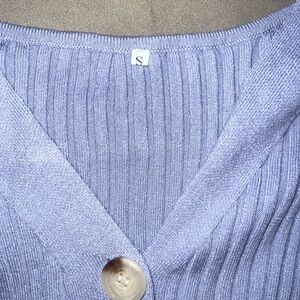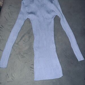 Slim ribbed knit dress in a soft light blue. Features long sleeves and a V-neck with three decorative buttons. Stretchy, body-hugging silhouette. Elegant and simple. Never Worn Size Small