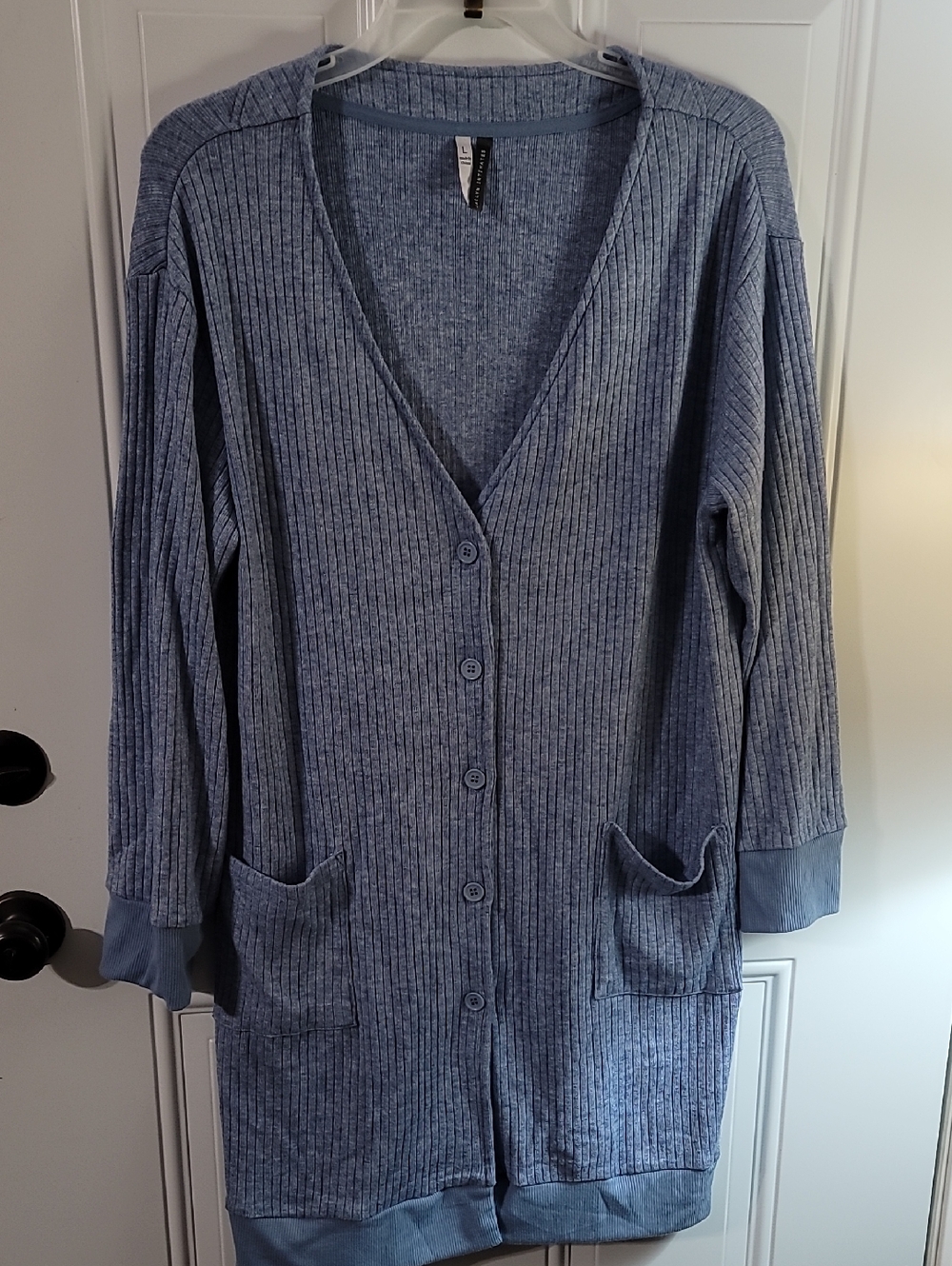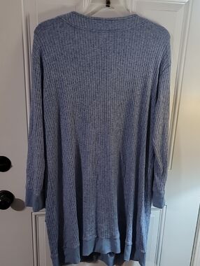 NWT Long ribbed cardigan in a soft light blue. Front button closure. Two front pockets. Cozy, relaxed fit. PTP 25 Length 38