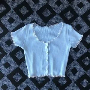 Elevate your style with this chic light blue ribbed button-up top. Perfect for casual outings or a day at the office. The soft fabric and delicate design offer both comfort and elegance.