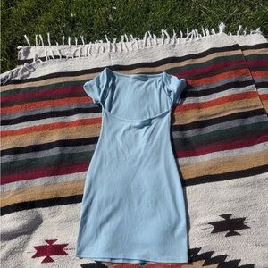 Stylish light blue ribbed dress with short sleeves. Open back. Worn 1 time