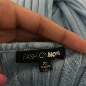 Stylish light blue ribbed knit set. Includes top and pants. Perfect for a cozy look.