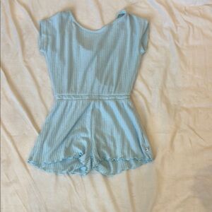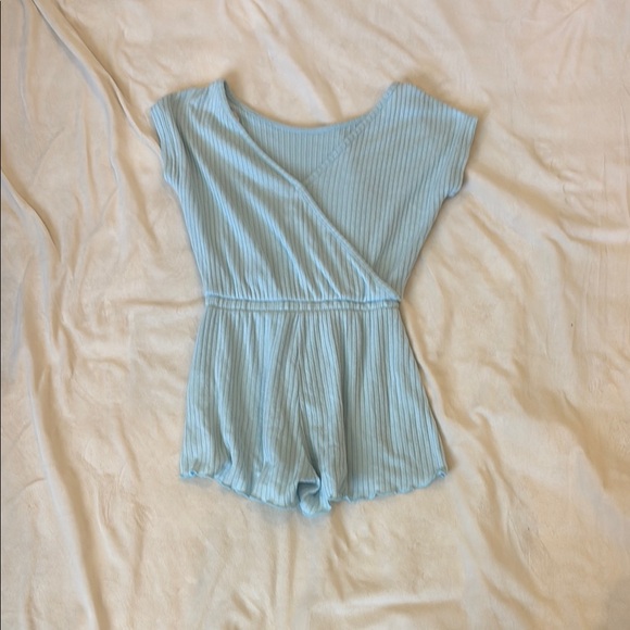 Stylish light blue ribbed romper. Features a wrap design and short sleeves. Girls size medium, meant to be a loose romper fit. Coverup over swimsuits also. Few visible signs of wear or tear. In pretty good condition.