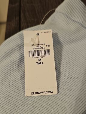 A versatile light blue sleeveless tank with a fitted, ribbed silhouette. Soft, stretchy fabric for comfortable all-day wear. Clean neckline and tailored seams for a polished casual look. Size is M Tall, but this is very cropped so fits more like a medium.