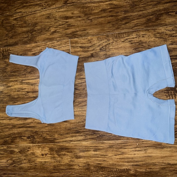 Stylish light blue ribbed two-piece set. Includes a crop top and high-waisted shorts.