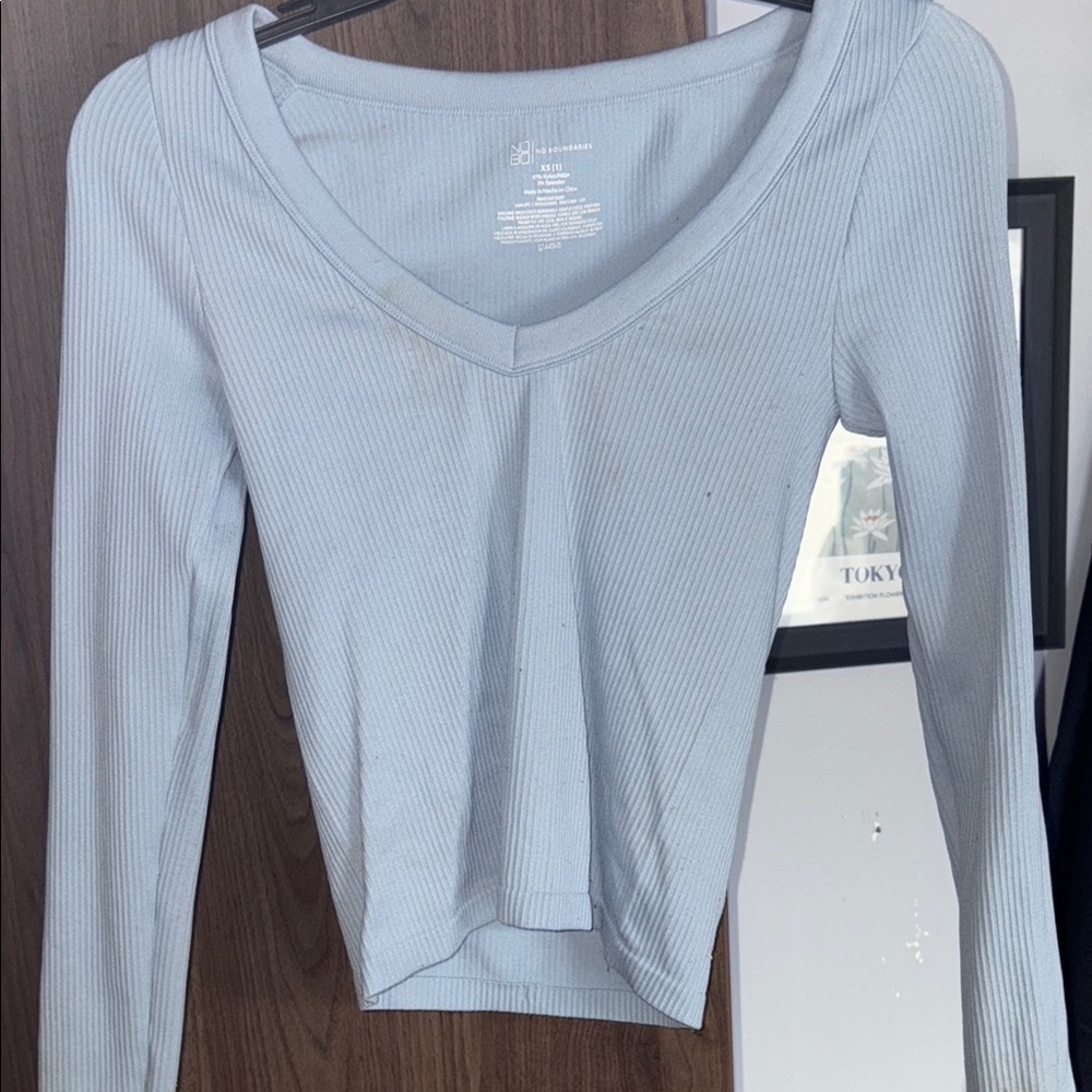 Elevate your wardrobe with this stylish light blue ribbed V-neck top. Perfect for any occasion, this top offers both comfort and elegance.