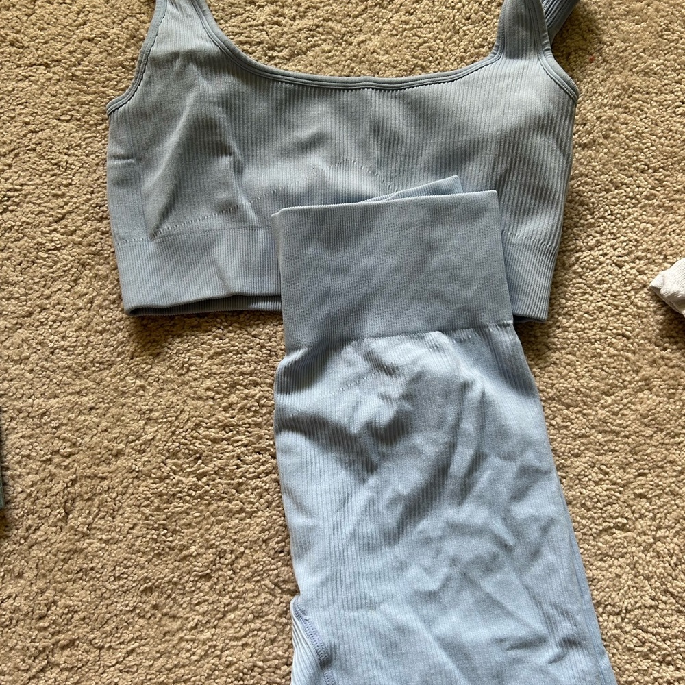 Stylish light blue ribbed workout set. Includes a crop top and leggings. Perfect for yoga or gym sessions.
