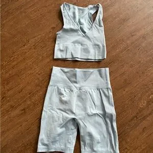 Stylish light blue ribbed workout set. Includes a sleeveless top and matching shorts. Perfect for gym or casual wear.