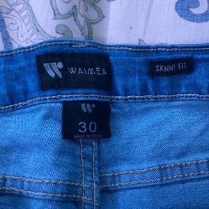 Light Blue Ripped Jeans,with a white paint design on the sides of the jeans.a 30 x 32 skinny fit with a taper.