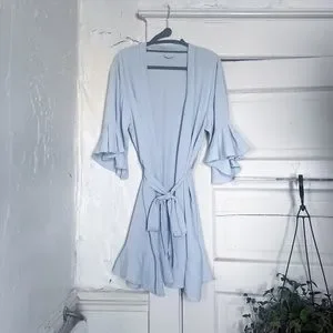 This flowy blue dressing gown has an interior tie-off, original sash, and romantic 3/4 sleeves.