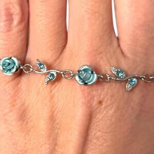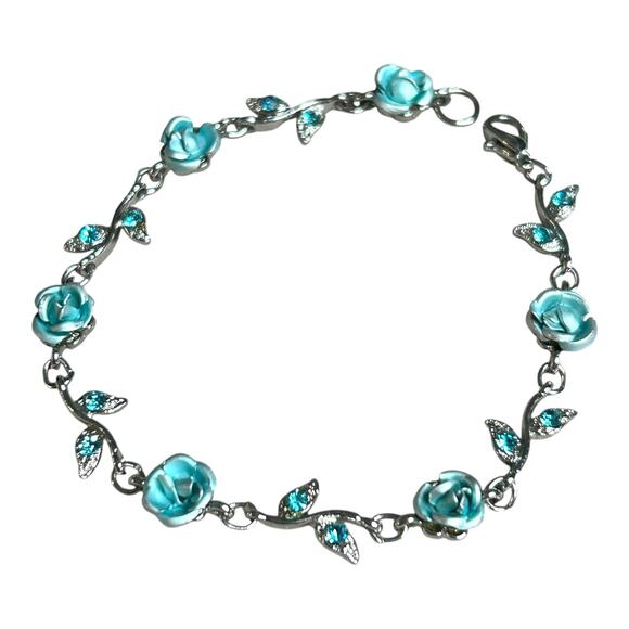 Light Blue Roses and Crystals Dainty Feminine Floral Silver Tone Bracelet