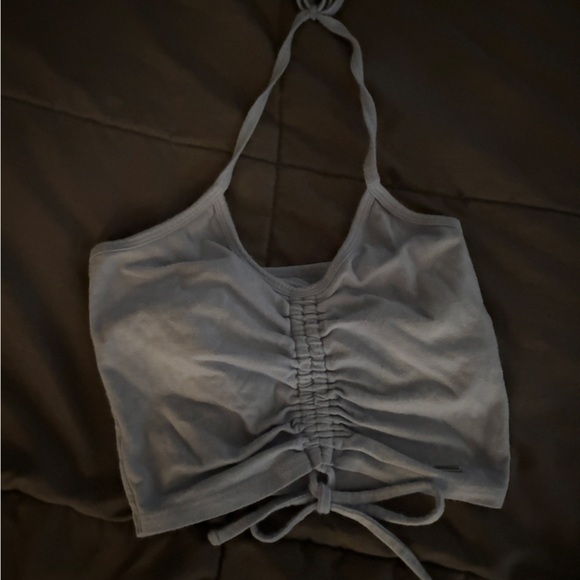 Soft light blue tank top with front ruched detailing. Thin shoulder straps and adjustable side ties. Minimal, versatile summer staple.