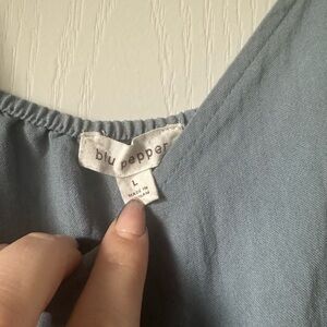 Light blue dress with tiered ruffle design. Sleeveless with a V-neckline. Perfect for casual outings. Hits mid-thigh.