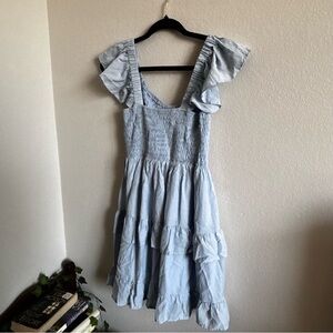 Soft light blue sundress with ruched bodice. Flutter ruffle straps with caps. Flowing skirt for easy wear. Lightweight and feminine look. Excellent condition! Great for spring or summer, casual or formal looks! Unbranded, size small!