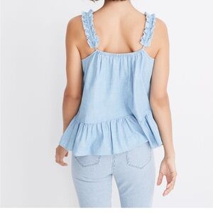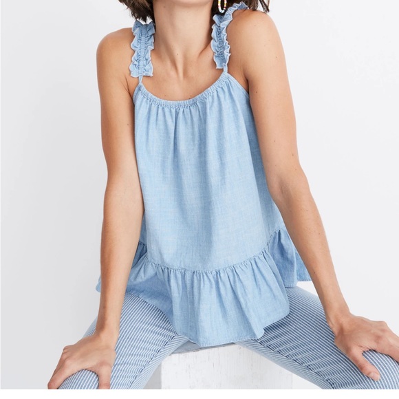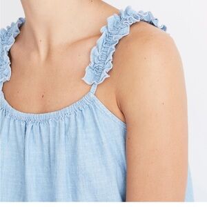 Elevate your style with this light blue ruffle strap top. Perfect for any occasion, this top offers a chic and comfortable fit.
