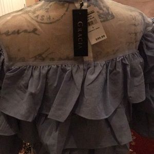 Brand New With Tag, very elegant light blue ruffle top purchased from Bloomingdales. Size S.