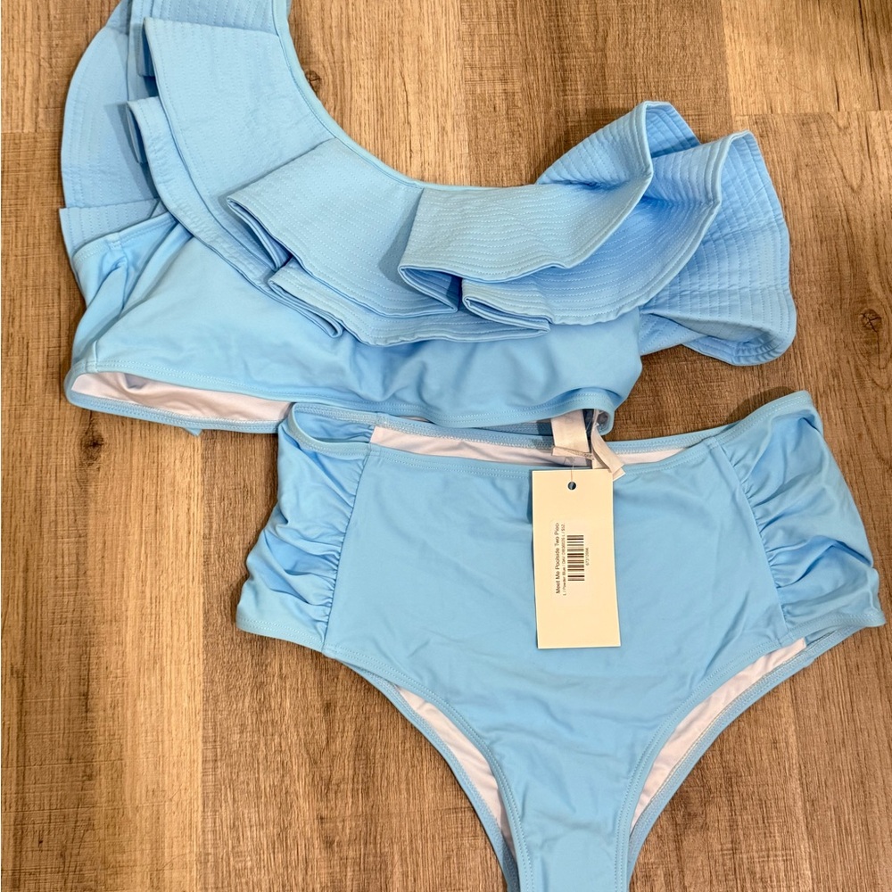 Enjoy the summer in this stylish light blue ruffled bikini set. Perfect for a day at the beach or pool.