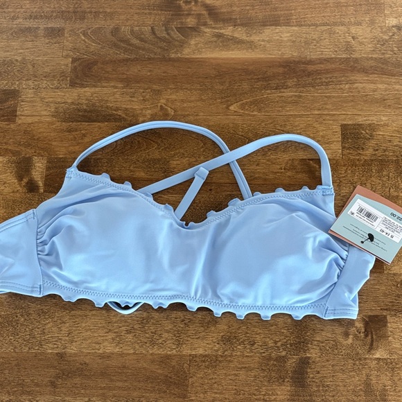 Stylish light blue bikini top with ruffled edges and criss-cross straps