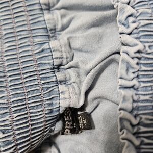 Express Women’s Blue Off The Shoulder Chambray Lyocell Ruffle Neck Mini Dress.