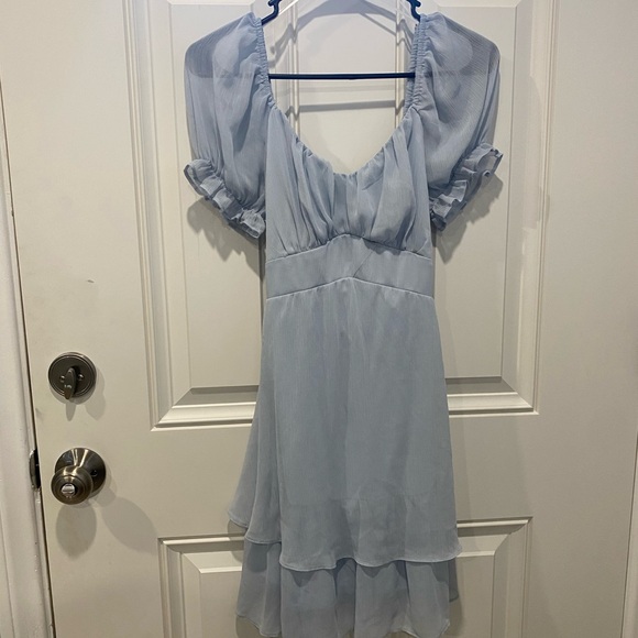 Chic light blue dress with ruffled sleeves and layered hem. Perfect for any occasion. Used Once.