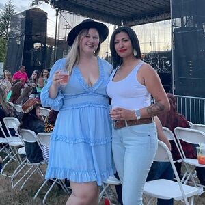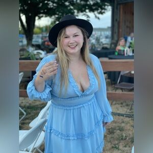 Elegant light blue dress with ruffle details. Perfect for any occasion.