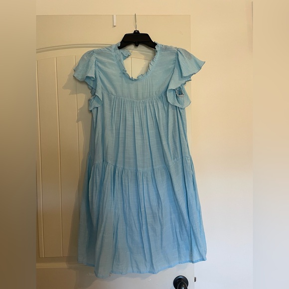 Charming light blue dress with ruffled sleeves. Perfect for a casual day out.