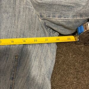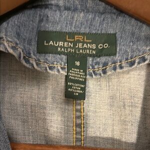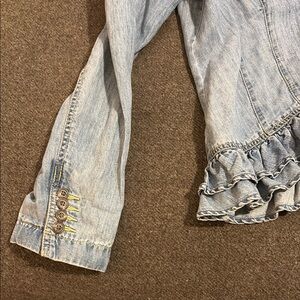 This chic jean jacket showcases a light blue hue with a playful ruffle hem, offering a modern twist on a classic design. Made from soft, washed denim, it provides a comfortable fit and a stylish look for any casual outing. Cotton and linen blend.