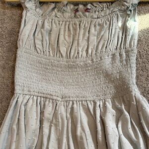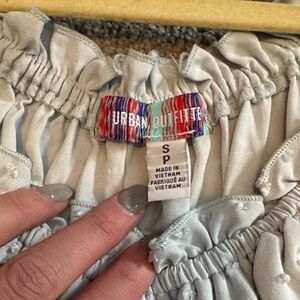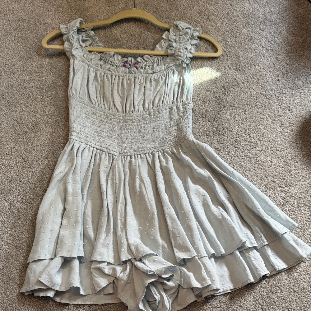 Stylish light blue romper with ruffled details. Ideal for casual wear.