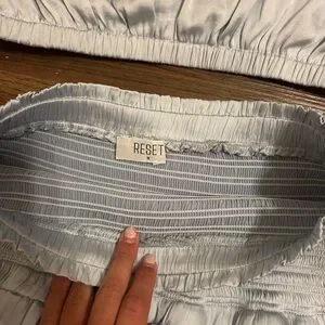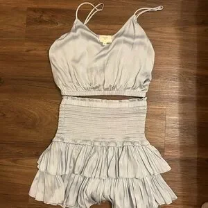 Chic light blue two-piece set with ruffled details. Perfect for a stylish look.