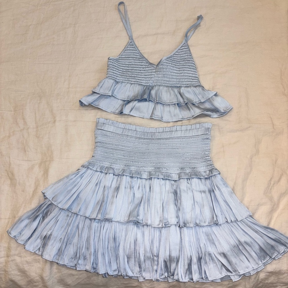 Stylish light blue two-piece set with ruffled details. Perfect for a chic look. Top is a Small and bottoms are Medium - they fit more like a small