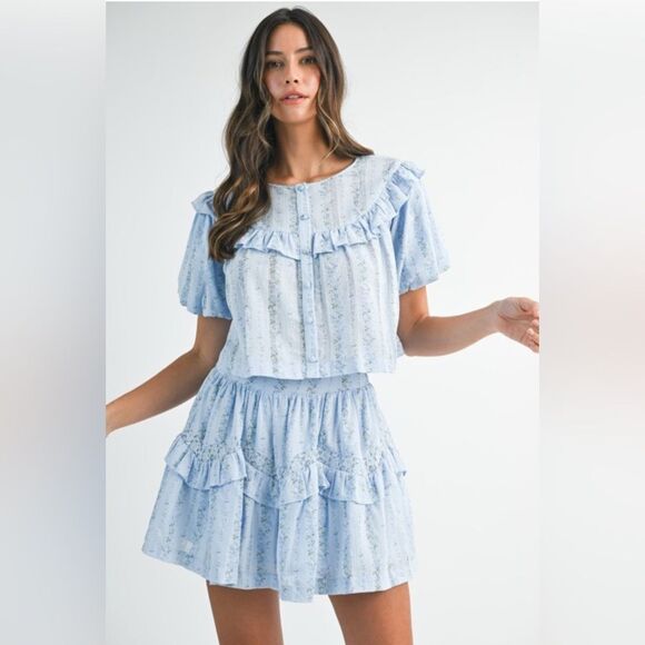 Chic light blue two-piece set with ruffled details. Perfect for a stylish look.