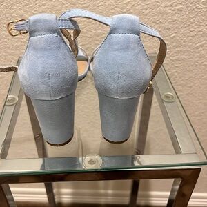 Light blue suede man made material with ankle strap and 3in block heels. In good used condition, very clean.