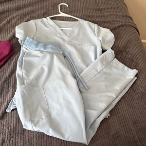 Comfortable light blue scrub set with top and pants. Ideal for medical professionals.