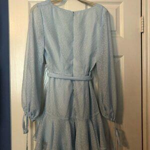 adorable selfie leslie wrap dress with puffy sheer sleeves, adorable light blue dot print, and ruffles