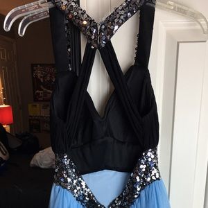 This dress is perfect for any event whether it be a junior dance, homecoming, or even prom! I only wore this dress once and it's still brand new! It has a beautiful scoop back then connects at the shoulders, the back is not too low so it is still appropriate for school aged dances, I wore this to my 7th grade may dance SO long ago. Whoever snags this beauty will LOVE it. If you'd like to see modeling pictures just ask! :)