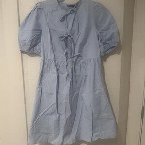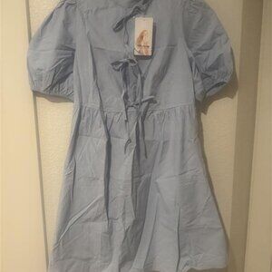Light Blue Short Sleeve Bow Tie Front Babydoll Mini Dress with Pockets - New