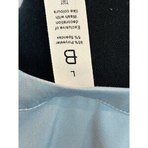 This product is a light blue silky blouse in size large with 3/4 sleeves and a V-neck neckline. It is designed for women and is from the brand B. This blouse offers a stylish and elegant look, perfect for various occasions. Its soft and silky material gives it a luxurious feel, while the flattering V-neck and 3/4 sleeves add a touch of sophistication to the overall design. Perfect for pairing with trousers or skirts, this blouse is a versatile and chic addition to any wardrobe.