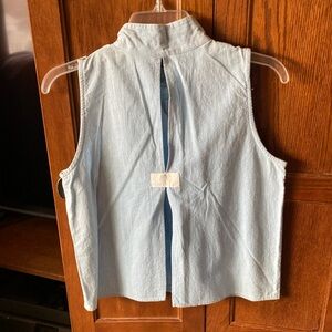 Stylish light blue sleeveless button-up shirt. Features a classic collar and front pocket.