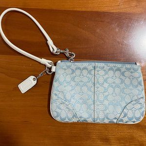 Light blue Coach wristlet with white leather strap and Coach tag. Like new. Perfect size for phone, keys, change.