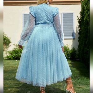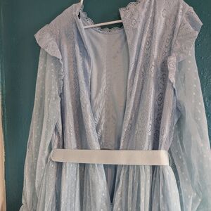 this light blue dress has sheer sleeves. the zipper goes below the waist. There are no blemishes.