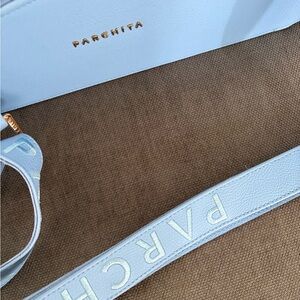 Almost brand new medium-size structured handbag in light blue. Features a top handle and a removable crossbody strap. Clean, fully lined interior and a modern, elegant shape,