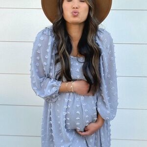 Introducing our Light Blue Textured Dot Smocked Square Neck Chiffon Maternity Dress—a dreamy, feminine addition to your maternity wardrobe! Made from lightweight chiffon with delicate textured dots, this dress features a flattering smocked bodice and a charming square neckline, designed to gently accentuate your growing bump. The flouncy, airy skirt offers comfort and style for any occasion—from baby showers to brunch dates. Elastic puff sleeves and a flowy fit make it perfect for all-day wear. Effortlessly chic, this dress keeps you cool, comfy, and stylish throughout your pregnancy!
